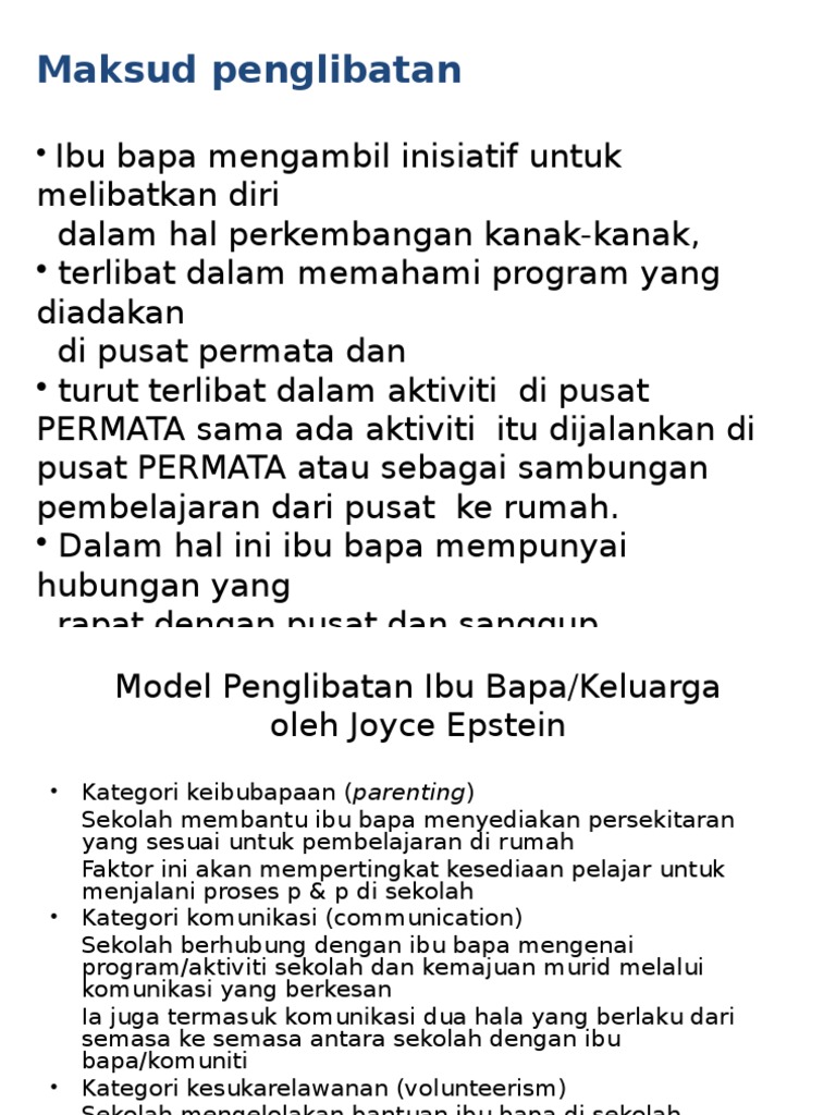 Tambahan pula PKP ini bersifat sementara ibu bapa masih perlu menghantar anak ke tadika dan taska manakala pengusaha pula masih perlu membuka semula insitusi mereka selepas pandemik COVID-19 berakhir nanti Insya-Allah. 14 Tujuan Kajian Kajian ini bertujuan bagi melihat kepentingan penglibatan ibu bapa dalam pelaksanaan kurikulum dan kokurikulum di Tadika. 5 Strategi yang Berjaya untuk Meningkatkan Penglibatan Ibu Bapa.